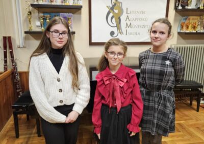 2024.11.28-án a Zala Vármegyei Művészeti Iskolák Növendékhangversenyén, melynek idén a Letenyei Alapfokú Művészeti Iskola volt a házigazdája, három növendékünk képviselte iskolánkat: Szrenka Kornélia – furulya, Gáspár Nóra – zongora és Szép-Szögi Léna – hegedű.