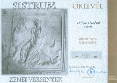 Február 18-án a XXIII. Sistrum Zenei Versenyeken iskolánk két hegedű szakos tanulója mérette meg tudását Szombathelyen. Szép-Szögi Léna előadását ARANY, Márkus Noémiét BRONZ minősítéssel jutalmazta a zsűri. Felkészítő tanáruk Magyar Enikő, zongorán kísért Tóth Nóra.