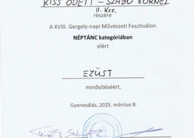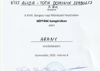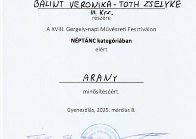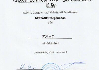 A XVIII. Gergely-napi Művészeti Fesztiválon iskolánk néptáncosai kiemelkedő eredményeket értek el. Bálint Veronika és Tóth Zselyke arany, Kiss Alida és Tóth Dominik Szabolcs arany, Dan Roxana Alexandra és Ignácz Tamás ezüst, Csóré Dorina Kíra és Gömbös Luca ezüst, Dézsenyi Nóra és Kurucz Regina Anna ezüst, Kiss Odett és Szabó Kornél ezüst, Tóth Réka és Lohonya Borka ezüst, a Csicsergők kamaracsoport kiemelt arany, a Pacsirta néptánccsoport kiemelt arany minősítést szerzett. Felkészítő tanáruk: Laskay Annamária. Sikerükhöz sok szeretettel gratulálunk!